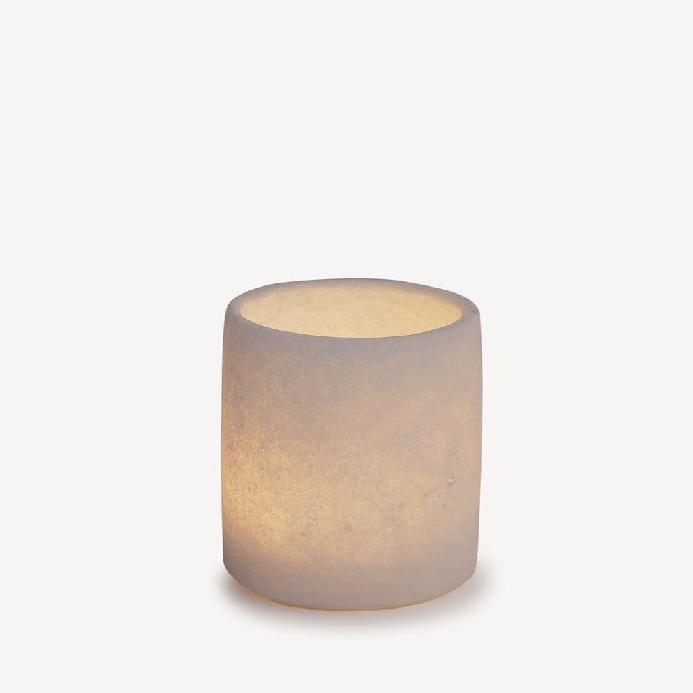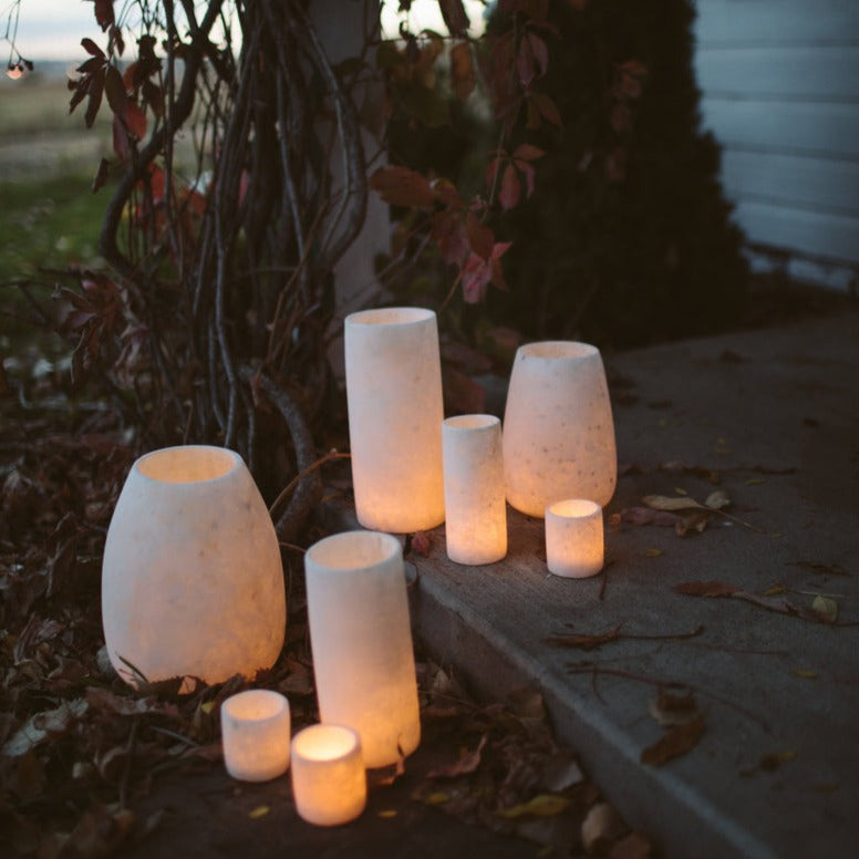 Hand-carved alabaster stone candleholders in a petit cylinder form, radiate a warm, graceful glow at any time of day via a single tea-light. Rich with earthy minerals, these stone candleholders may slightly vary in color hue, size, and texture. Handmade by Egyptian artisans and designed in Denmark. P