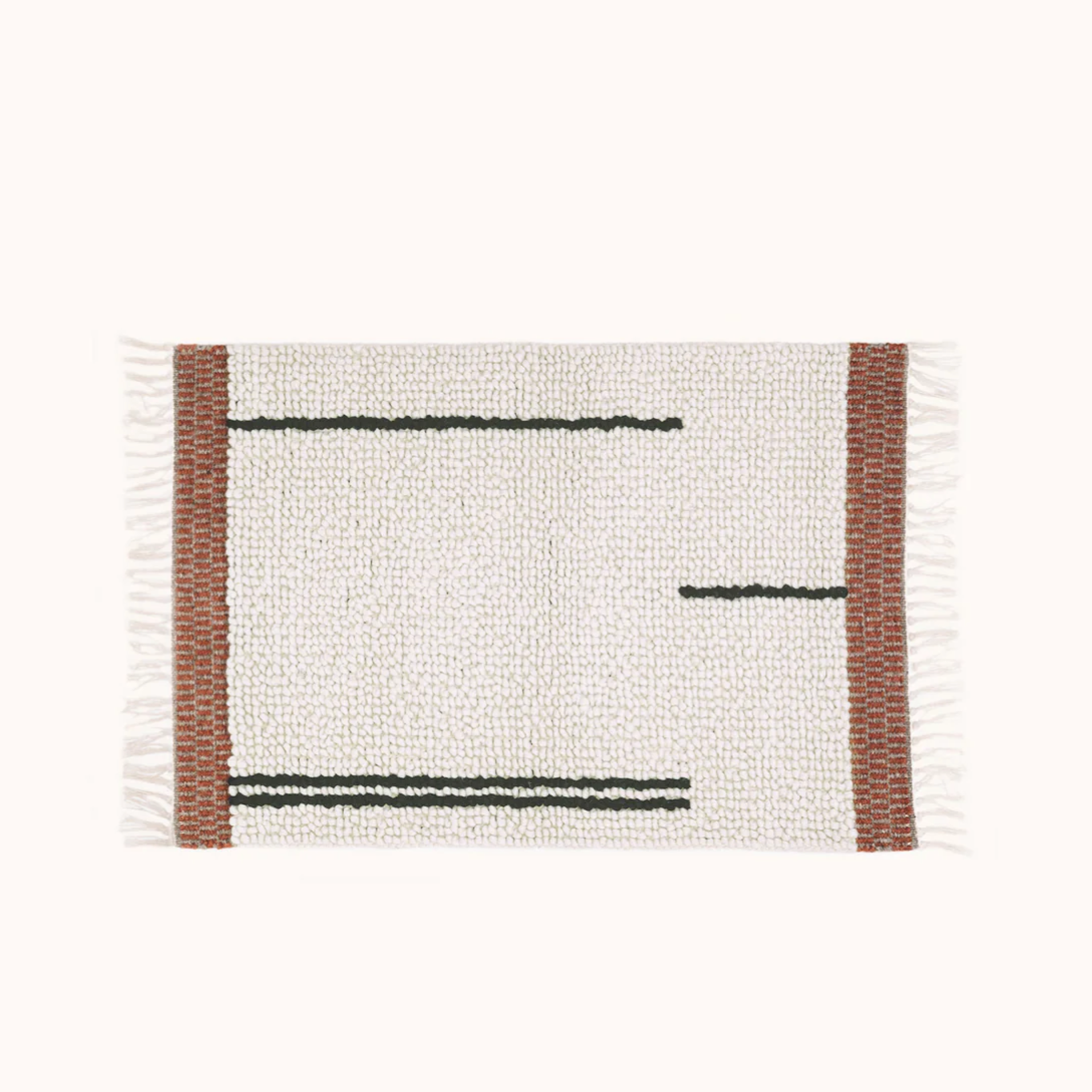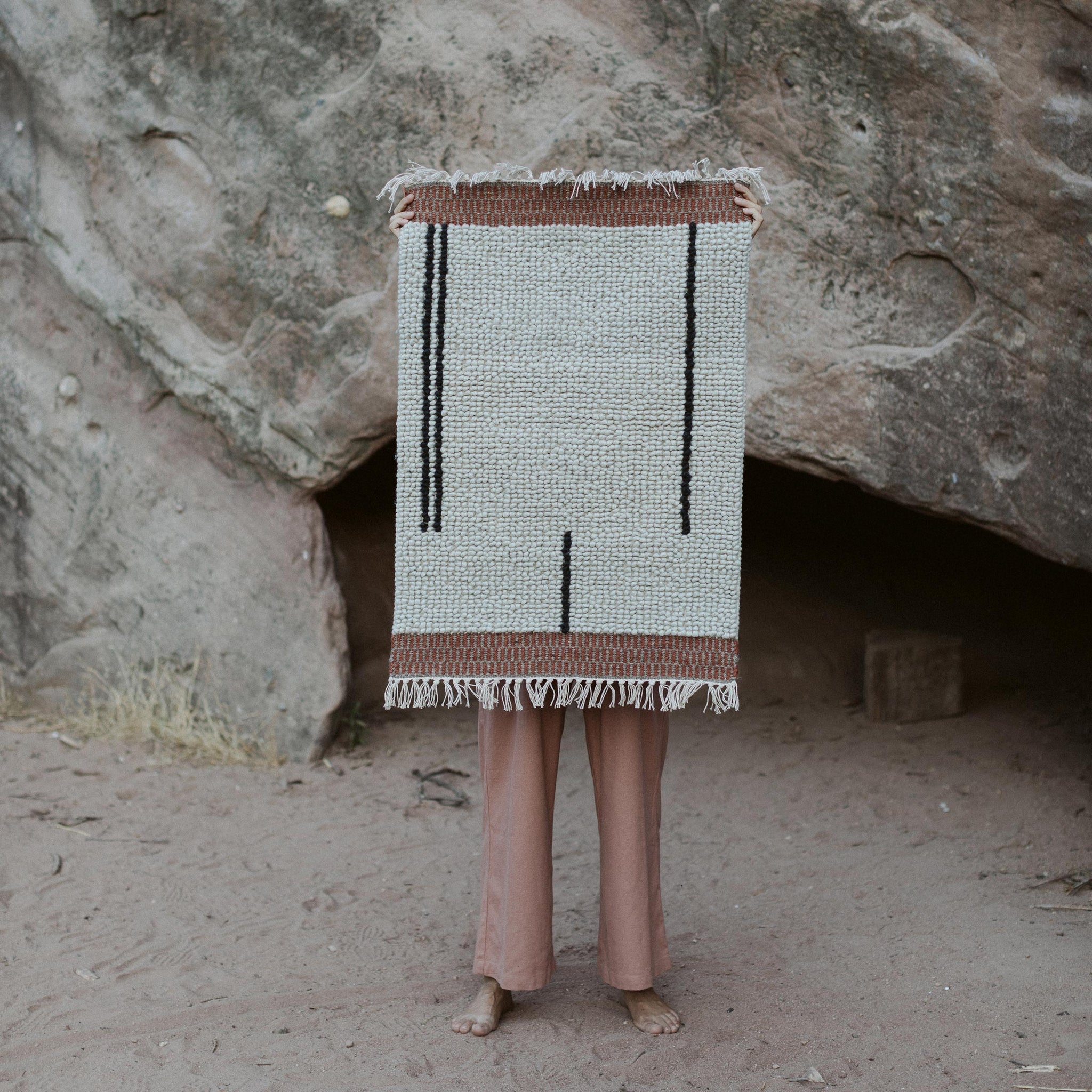 Our Amari Rug features hand woven looped tufting with an abstract broken stripe design and subtle terracotta bands at both ends. The 2' x 3' size is perfect for next to the bed or as a layering piece throughout the home.