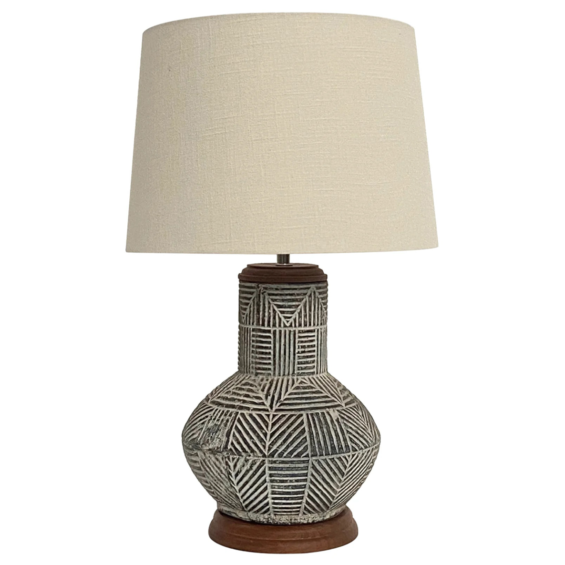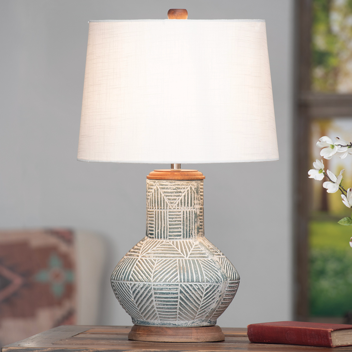 Create southwestern style in your den with the Arizona Wood Table Lamp, enhanced with a tribal geometric and striped design carved in exotic wood.