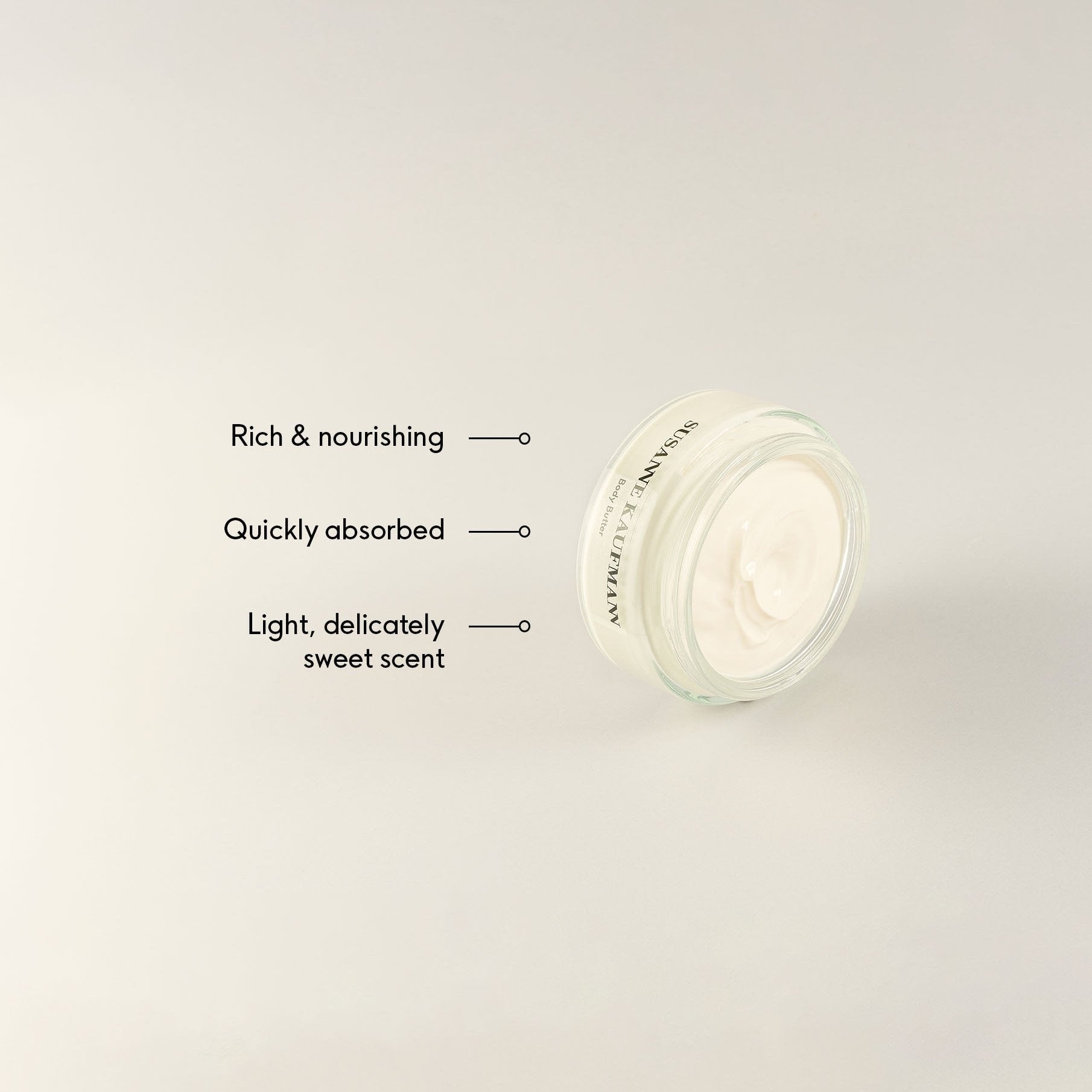 An intensely nourishing body butter designed to restore moisture and leave the skin velvety soft, smooth and in optimal condition. The luxuriously rich, yet fast-absorbing formula infuses the skin with a replenishing blend of essential fatty acids, vitamins and minerals to rescue even the driest and lackluster of limbs. Shea butter helps to strengthen the skin barrier, olive fruit oil saturates the skin with intense and lasting moisture, and whey powder supports the skins natural pH balance. Upon application, the buttery blend melts like a dream, imparting a delicate, sweet scent and cloaking the body with moisture, to reveal sublimely smooth skin from shoulder-to-toes.