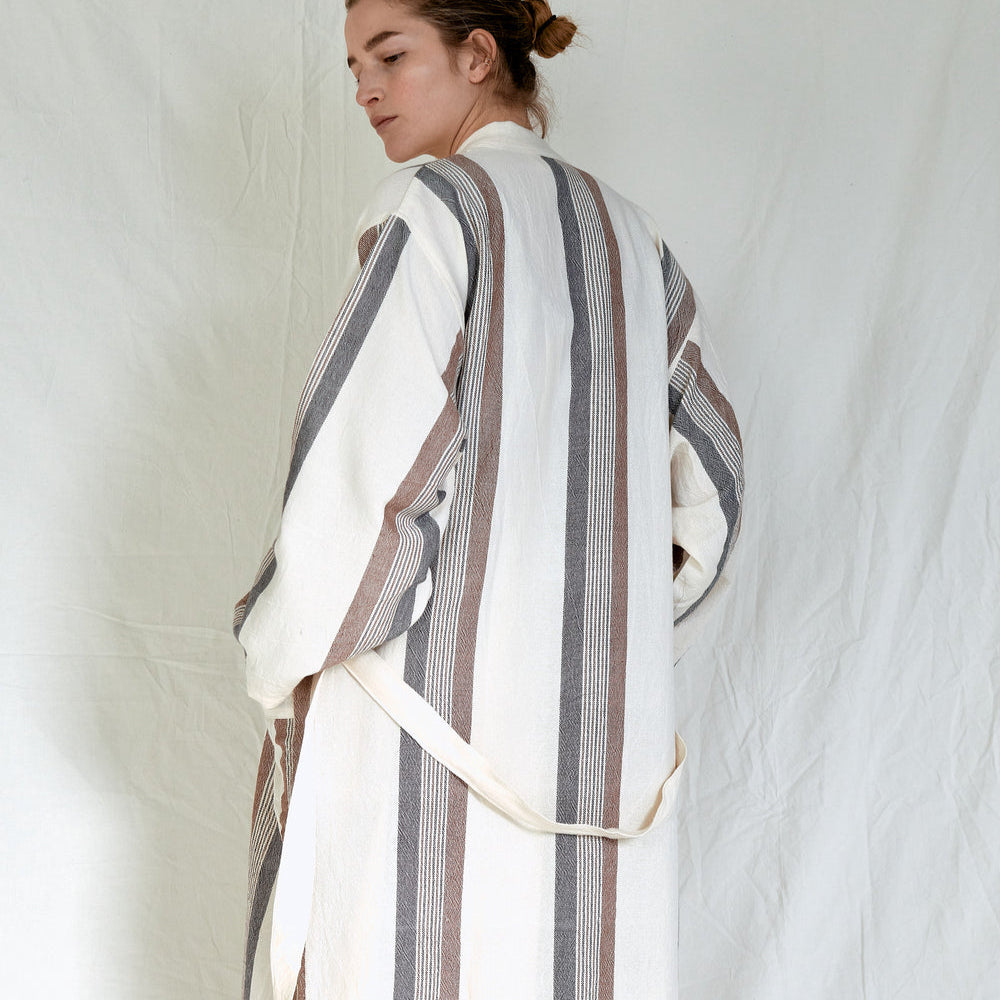 Crafted on the coast of Turkey, our Brown Cream Nomad Long Robe is hand loomed using traditional techniques and woven with 100% premium Turkish cotton. Similar to a Turkish towel, it is highly absorbent, lightweight, eco-friendly, and quick to dry. Lounge in your robe by the sea or layer it over a lightweight dress. Experience how your robe becomes softer and better with each and every wash!