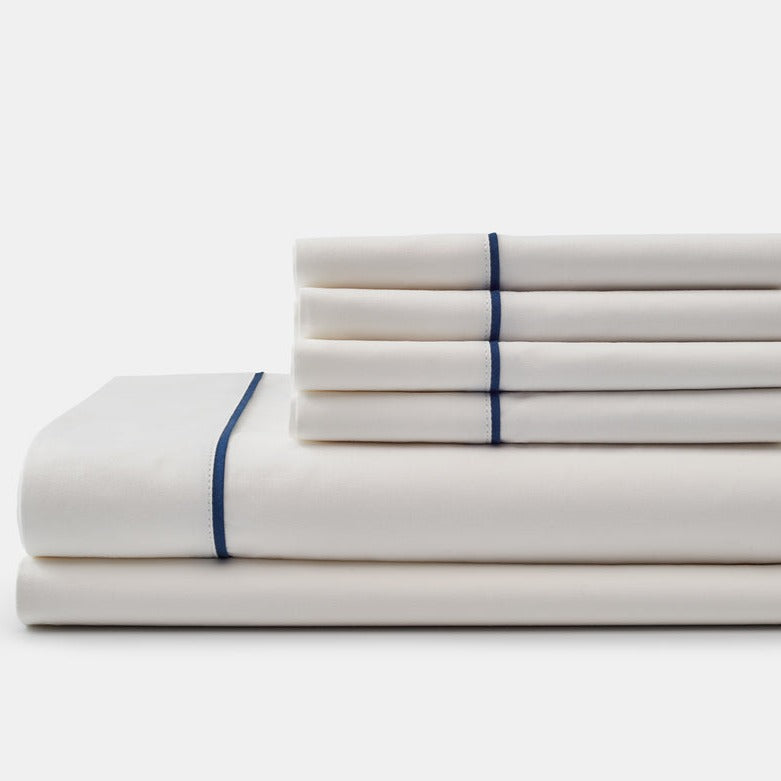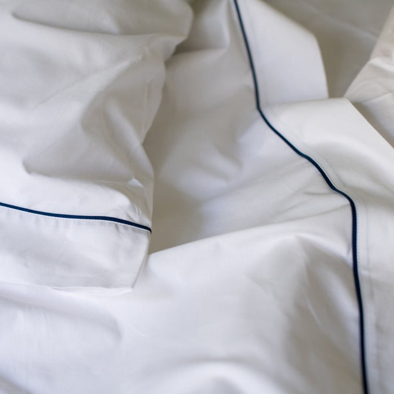 Crisp, soft and luxurious cotton sheets, with a fine line of grey or blue piping for added elegance, will give you a great night's sleep, keeping you cool in the summer and warm in winter. 100% USA grown, spun, woven and sewn.