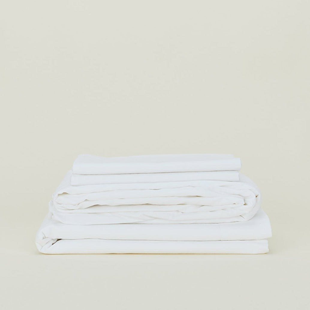- A flat sheet, fitted sheet, + set of pillowcases in Hawkins percale