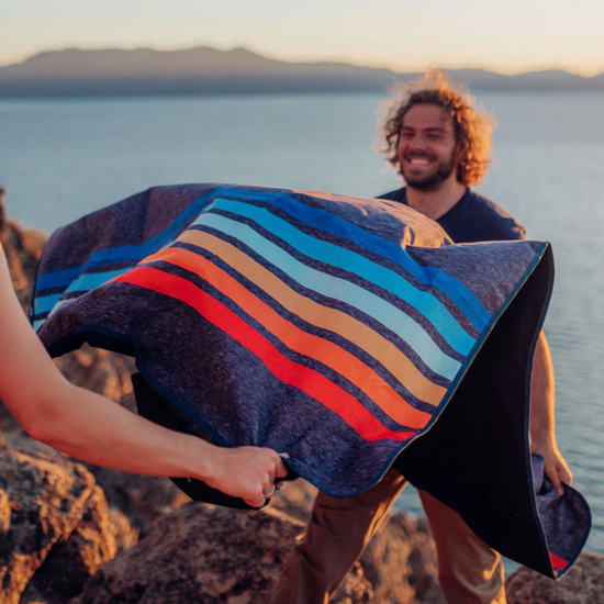 The perfect heathered blue-grey with a pop-of-color stripe, feeling like Southern California in the 70s. With a waterproof underside, this ultra-packable Everywhere Mat is the perfect crash pad for the beach, the pool or the backyard.