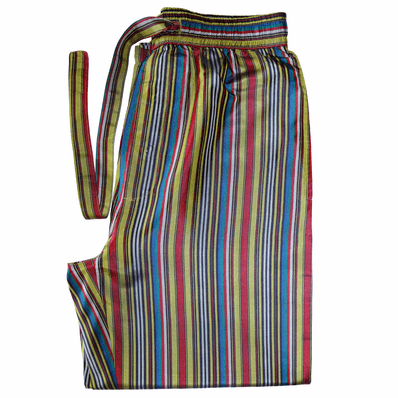 Palatial Grand Pasha Mulberry Silk mens pajama pants in exquisite hand-loomed, yarn-dyed Madras stripes. Soft, smooth, light, elegant and glorious. Try one on, and you'll feel like you're on a smooth flying carpet. For lounging, reclining, dreaming, or just feeling ultra cool.