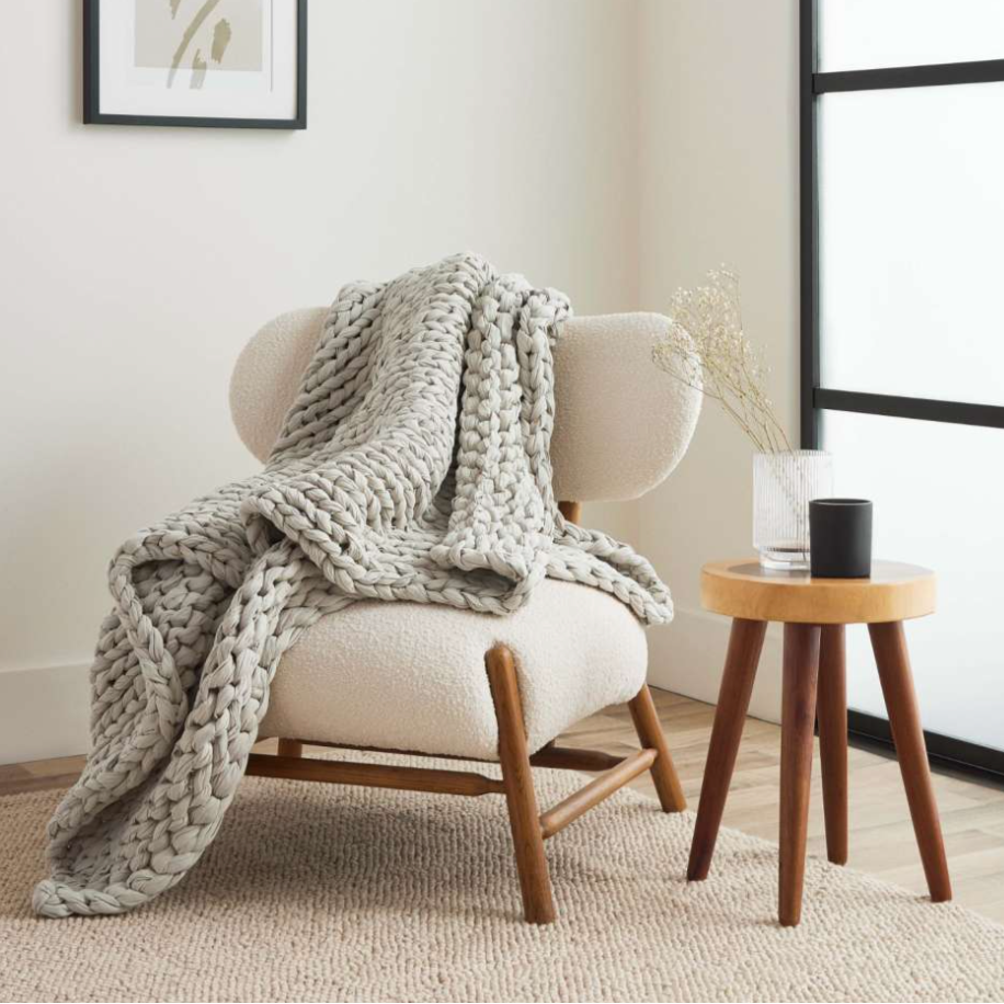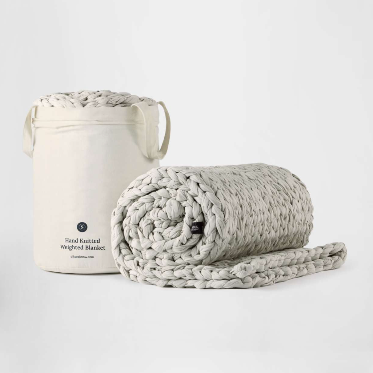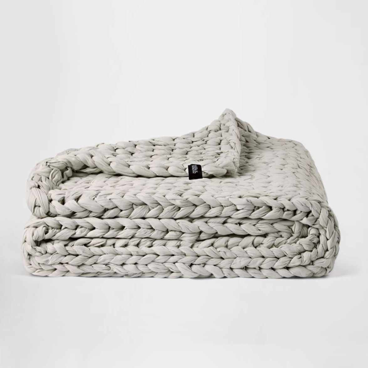 Woven with natural cotton, their hand knit weighted blanket provides all of the beneficial stress-free comfort of a traditional weighted blanket without pesky glass pellets.