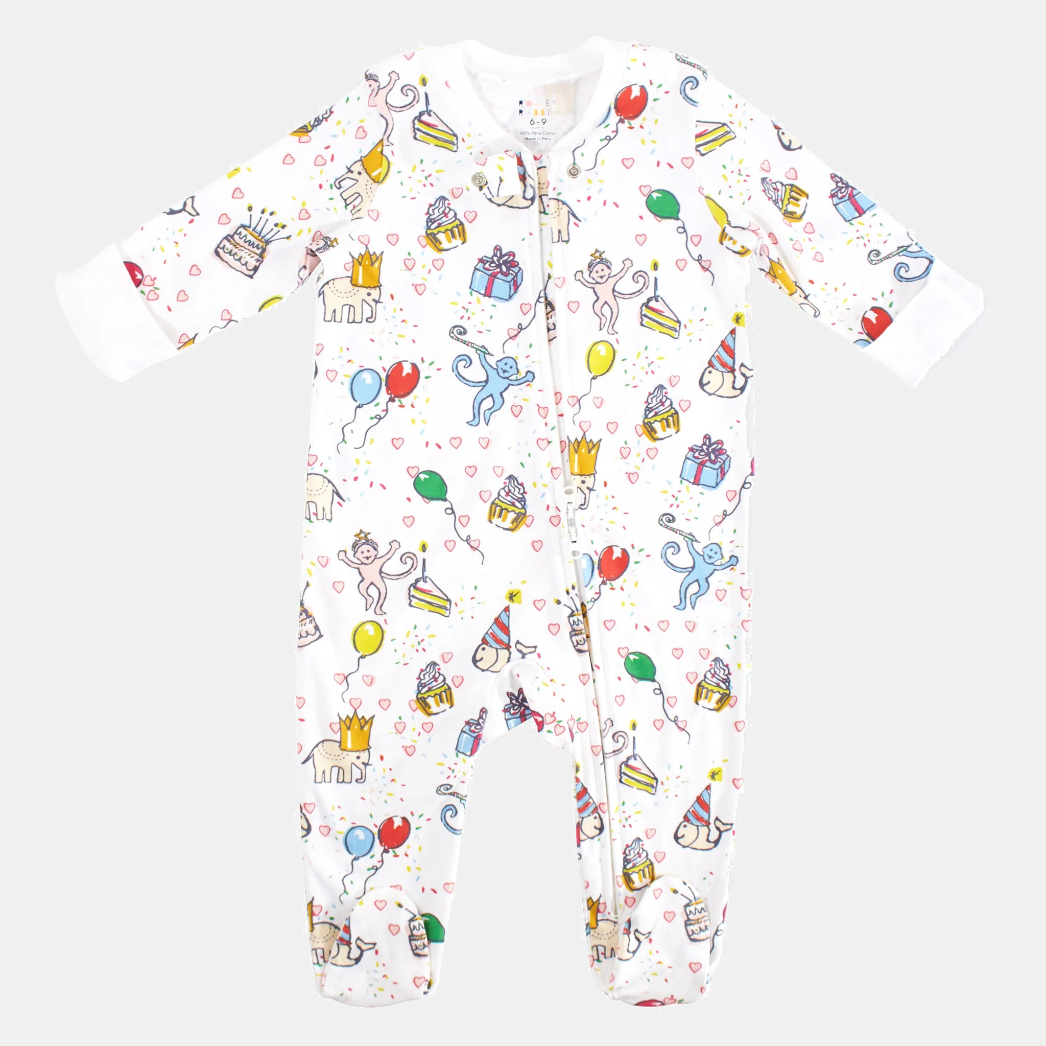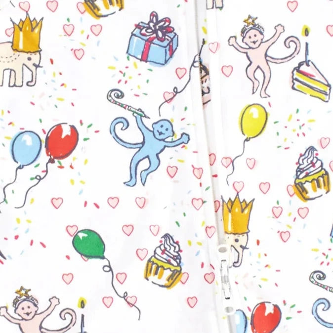 Every day is worth celebrating in a sleeper this sweet. This long-sleeved footie PJ is covered in colorful monkeys, balloons, and birthday cakes to welcome your new addition. The Pima cotton fabric is soft and easy to care for and the two-way zipper makes changes a snap ... or is it a zip?