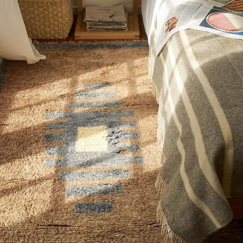 Made by skilled artisans using time-honored techniques in Bhadohi, India. Limited quantities. 100% New Zealand wool hand-knotted on cotton warp. Joram is inspired by a traditional Turkish Tulu, subtle in design and hue, with a geometric motif and versatile palette. It has been hand-washed multiple times to achieve extra-soft texture.