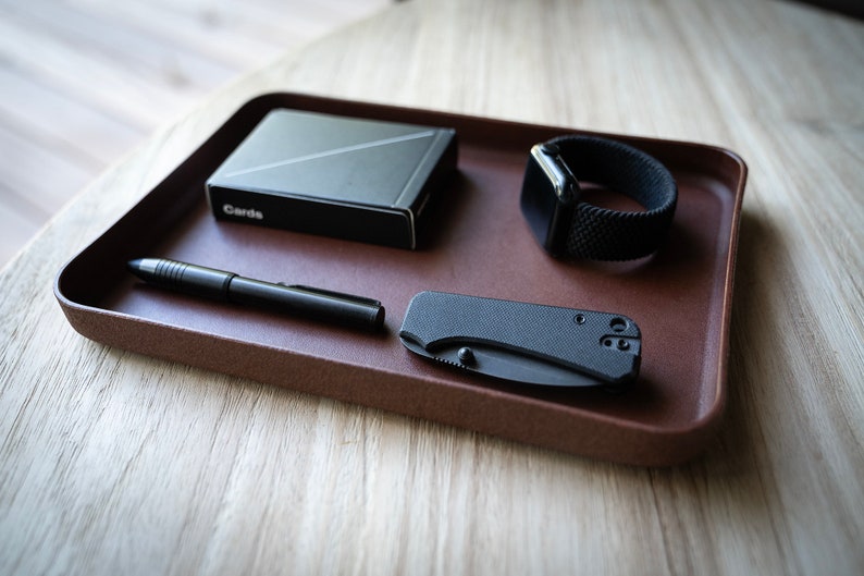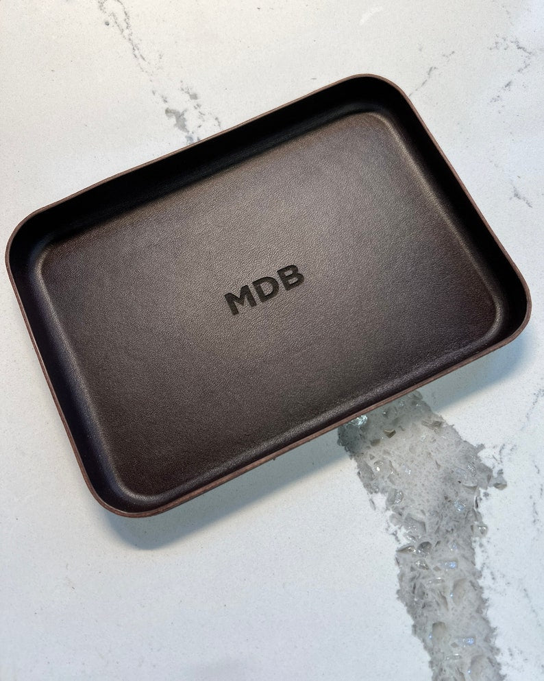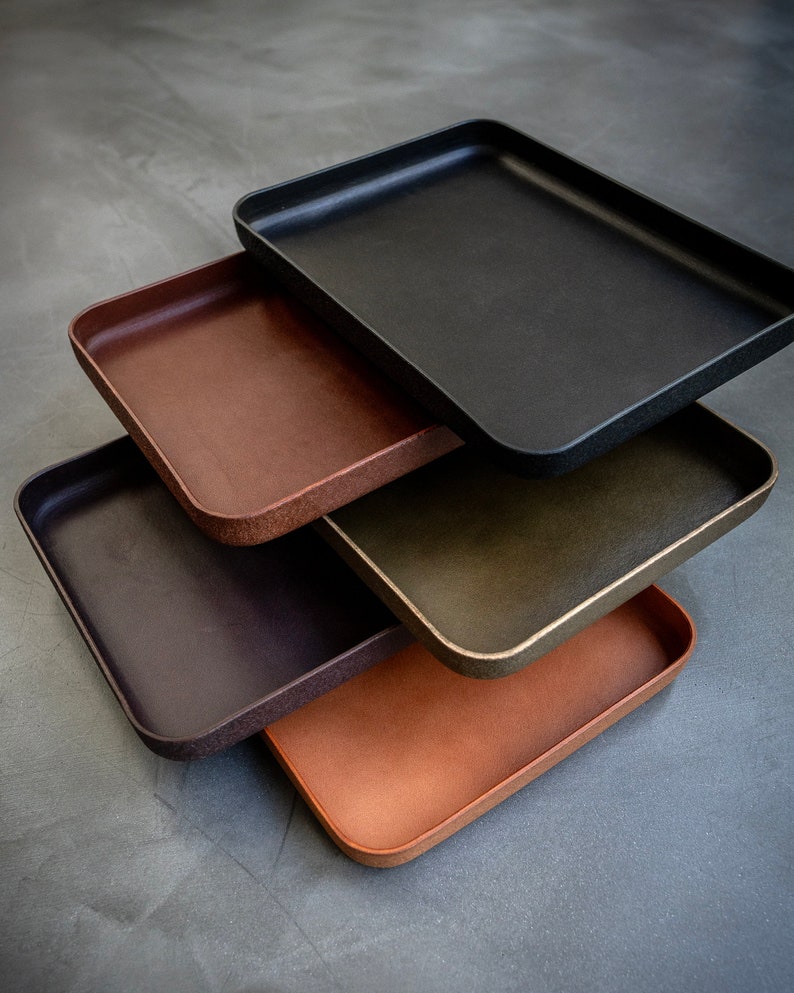 Our molded leather valet trays are hand made in the USA from vegetable tanned, full grain leather. Perfect for corralling all your everyday carry items like keys, spare change, wallets and pocket knives.