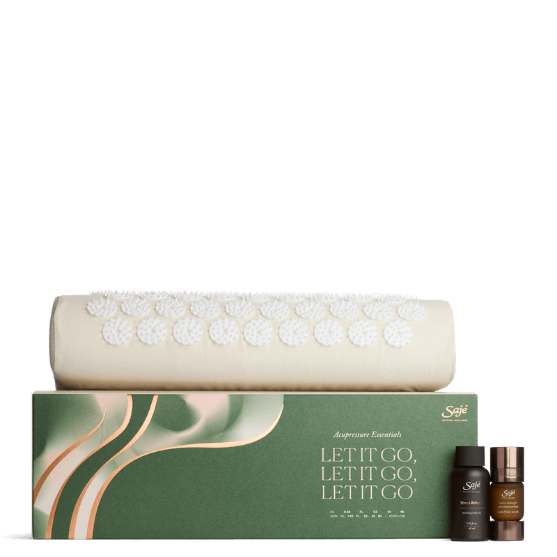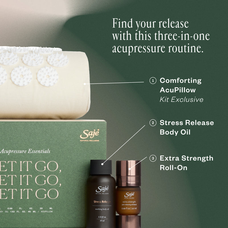 Let comforting energy flow. Engage pressure points to reduce shoulder and neck tension with soothing Stress Release body oil, a restorative AcuPillow, and Extra Strength pain-relieving roll-on. Available for a limited time.