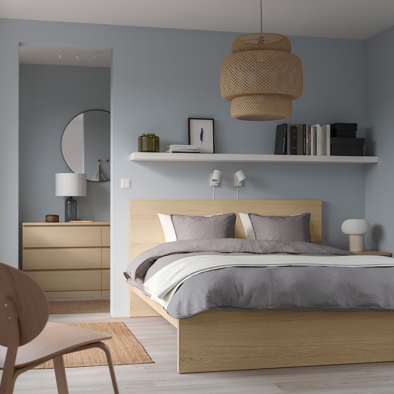 A clean design with solid wood veneer. Place the bed on its own or with the headboard against a wall. If you need space for extra bedding, add MALM bed storage boxes on casters.