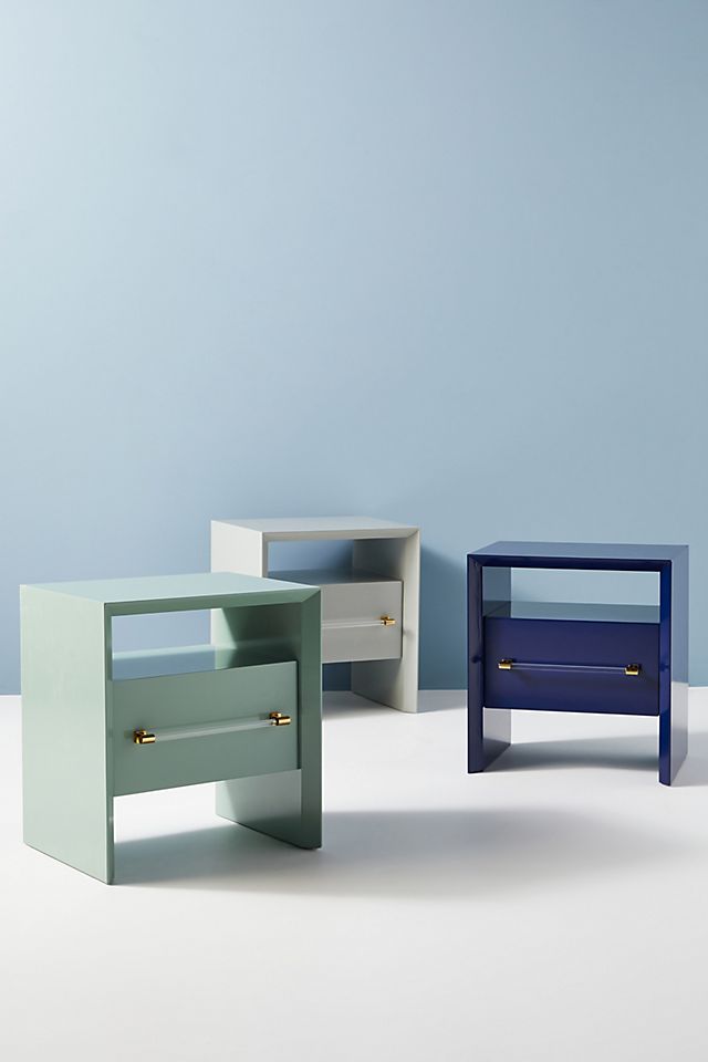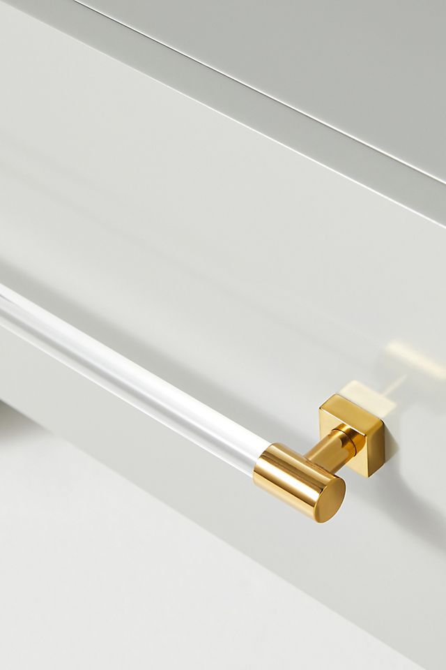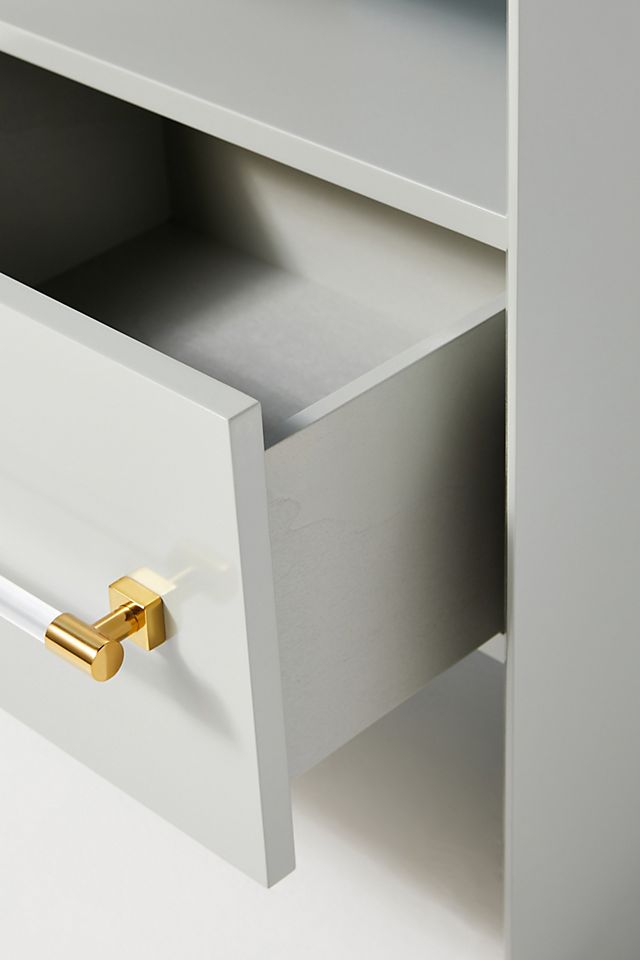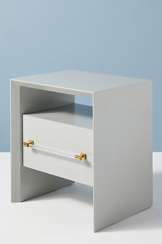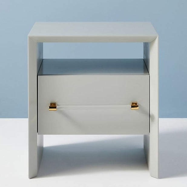 A harmonious pairing of gleaming brass and modern lucite accents punctuate the polished lacquer of our neatly proportioned Merriton collection. Featuring a streamlined, chamfered-edge silhouette, this nightstand introduces refined glamour to your bedroom.