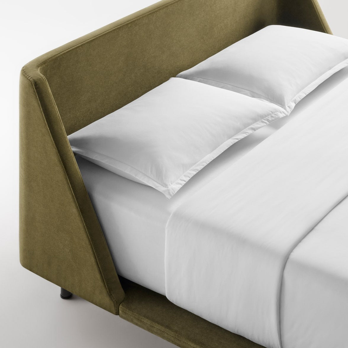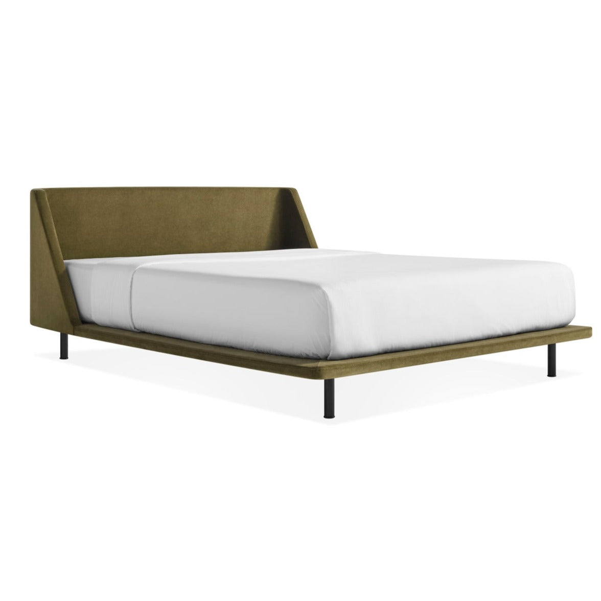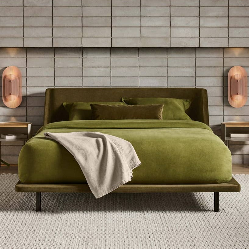 What do you get when a curved, upholstered headboard flows into a slim, padded frame? One seriously good-looking bed. It's enough to make you want to leave the lights on. Black powder-coated steel legs seem to disappear beneath the bed frame.
