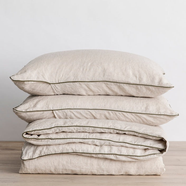 Crafted from 100% linen woven from European flax and pre-washed for a soft vintage feel from day one. Finished with a piped border. Upgrade your bedroom with our Piped Linen Duvet Cover Set in Natural and Forest hues. Crafted from premium European flax, these duvet covers feature contrasting piped edges, adding sophistication to your sanctuary. Elevate your bedding with style and comfort.