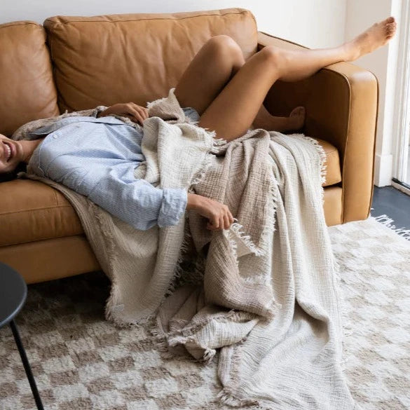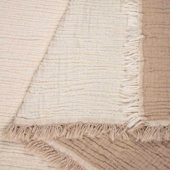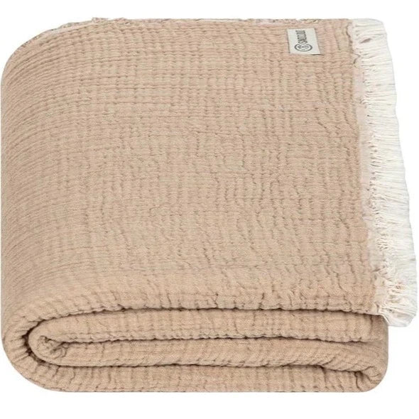 Featuring a double-sided taupe and beige color, this 100% Turkish Organic Cotton puts the party in Party Blanket with its jumbo size. Not only is it massive, the four-layer gauze jacquard weave makes it ultra-soft, lightweight, and breathable.