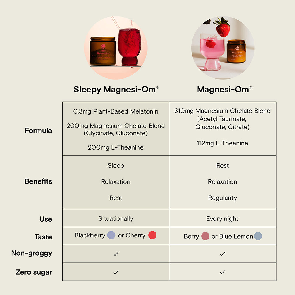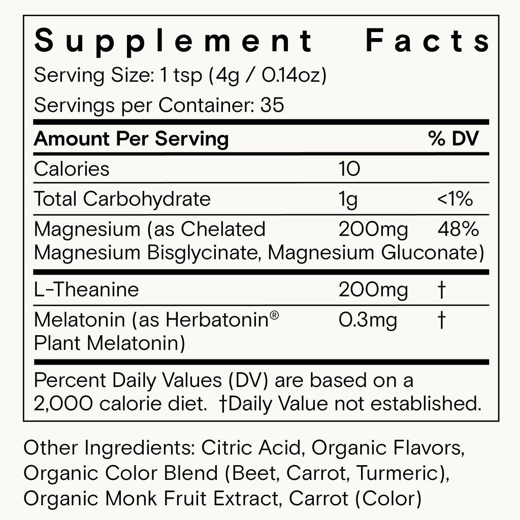 Jar: Melatonin regulates circadian rhythm. Unlike higher-dose melatonin that leaves you groggy in the morning, Sleepy Magnesi-Om® supports slumber without the hangover.* Our microdose of plant-based melatonin, extracted from organically grown alfalfa and chlorella, decreases duration to fall asleep.* Chelated, non-laxative magnesium bisglycinate and gluconate support the body’s stress response and relaxation.* L-theanine supports sleep quality.* This melatonin and magnesium sleep supplement instantly dissolves in water, tastes like organic blackberries or cherries (depending on your pick), and has zero sugar.