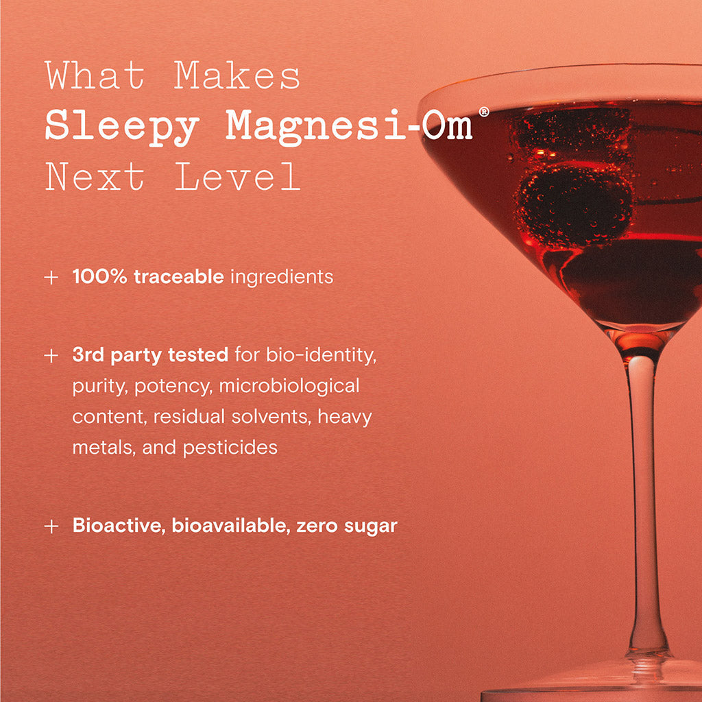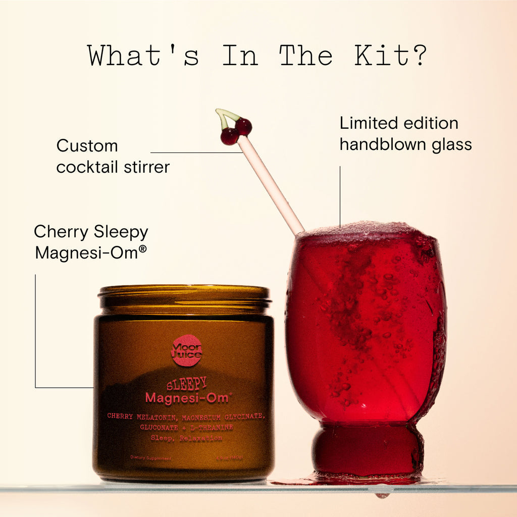 Kit: Choosing cherry? Make it an ultra-chic nightly ritual. The limited edition Cherry Sleepy Magnesi-Om Mocktail Kit includes Cherry Sleepy Magnesi-Om, a custom handblown glass from Hudson Wilder, and a glass cocktail stirrer with a cherry on top.